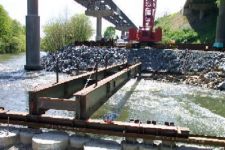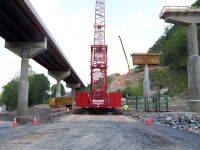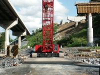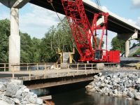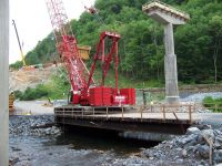 Demolition and reconstruction of northbound and southbound Interstate Route 81 bridges in Lebanon County, Pennsylvania required contractor equipment access for across the Swatara Creek along the environmentally sensitive Appalachian Trail. Peirce Engineering designed a temporary bridge, 30 feet wide by 74 feet long, to allow creek crossing for a 700,000 lb. Manitowoc 2250 crawler crane or two lanes of HS25 truck loading. The bridge components included W36 girders with a timber mat bridge deck and timber mat backwalls. The bridge abutments included foundation piles which were driven to bedrock and were then encased by tangent, concrete-filled, corrugated metal pipes to retain the approach causeway embankments.