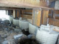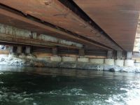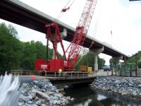 Demolition and reconstruction of northbound and southbound Interstate Route 81 bridges in Lebanon County, Pennsylvania required contractor equipment access for across the Swatara Creek along the environmentally sensitive Appalachian Trail. Peirce Engineering designed a temporary bridge, 30 feet wide by 74 feet long, to allow creek crossing for a 700,000 lb. Manitowoc 2250 crawler crane or two lanes of HS25 truck loading. The bridge components included W36 girders with a timber mat bridge deck and timber mat backwalls. The bridge abutments included foundation piles which were driven to bedrock and were then encased by tangent, concrete-filled, corrugated metal pipes to retain the approach causeway embankments.