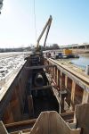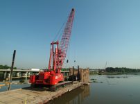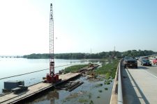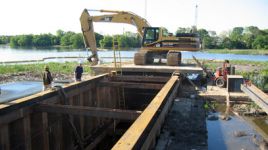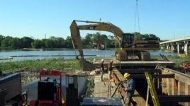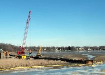 When the US EPA required the State of Maryland to improve sewage treatment in Baltimore County, just east of the City of Baltimore, the project engineer designed a 54 inch diameter sewer force main to connect the Stemmers Run Relief Wastewater Pump Station to the Back River Wastewater Treatment Facility. To minimize wetland disturbance and maximize access for construction equipment, the contractor engaged Peirce Engineering to design a combined cofferdam and work trestle. The resulting support structure was a steel sheet pile cofferdam, approximately 1700 feet long by 17 feet wide, internally braced, and capped with 28 foot wide transverse timber deck mats to serve as the access and work trestle for the trench excavation, pipe bent construction and trench backfill across the Back River.